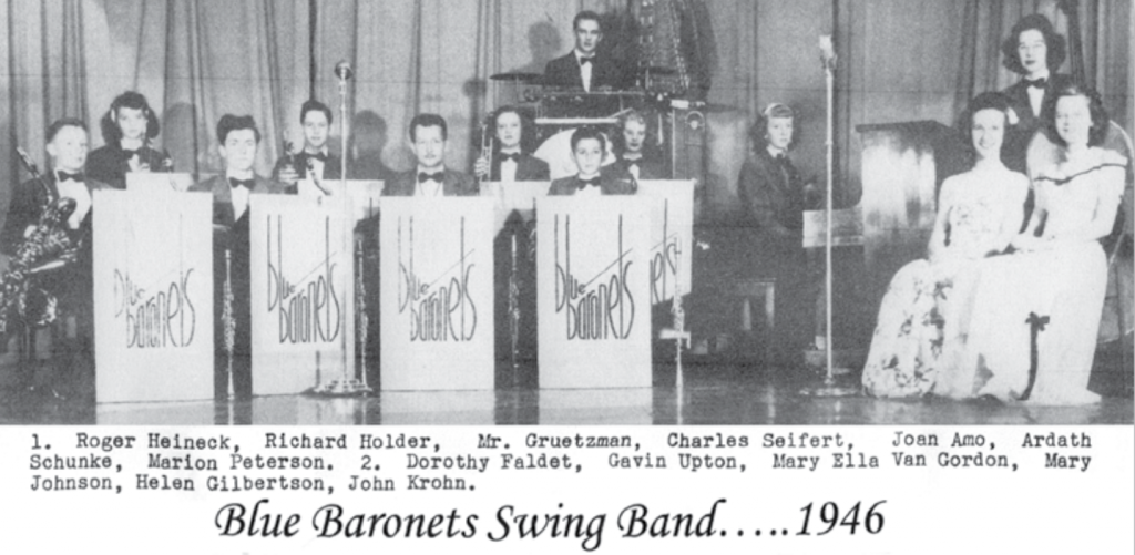 In high school Mary enjoyed all activities involving music. She sang in the mixed chorus and played in the band and orchestra. Most memorable was the swing band the “Blue Baronets,” which played at proms and dances all over the area. At one point the band became such competition for other local bands that members were persuaded to join the union. “We carried American Federation of Musicians union cards in high school.” Mary also sang in her church choir, which she continues to do today. For her music achievements she was given the “Adele W. Barber Music Award.” Many years later Mary helped organize