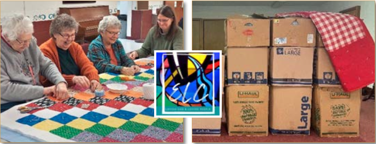 The history of Sewing Circle at Evangelical Lutheran Church dates to the 1940’s. Today, eighty years later, the Sewing Circle continues to reach out into the community by the making of quilts. In the late 1990’s the annual goal was 25 to 30 quilts. Now we think in the hundreds. In fact, during 2022, we produced 500 quilts. Because more folks from the community joined us, we were able to make 100 quilts for the flood victims in Kentucky. Our purpose is to provide warm quilts for those who need them. Quilts are donated to Project Christmas, Sleep in Heavenly Peace, Hospice, and Lutheran World Relief. Like the Kentucky project, we contribute to special needs as we learn of them.